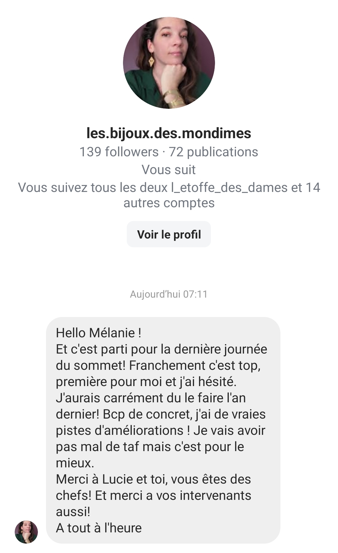 - 3 lives avec Mélanie et Lucie et les créatrices Premium du sommet. Soit 1 en avril, 1 en mai et 1 en juin pour continuer à te booster et t'aider à appliquer ce que tu as appris au sommet